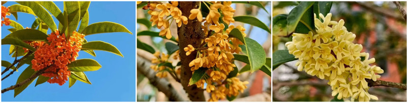 从左至右,分别是丹桂、金桂、银桂,颜色是区分它们的方法之一。 图片来源:上海植物园