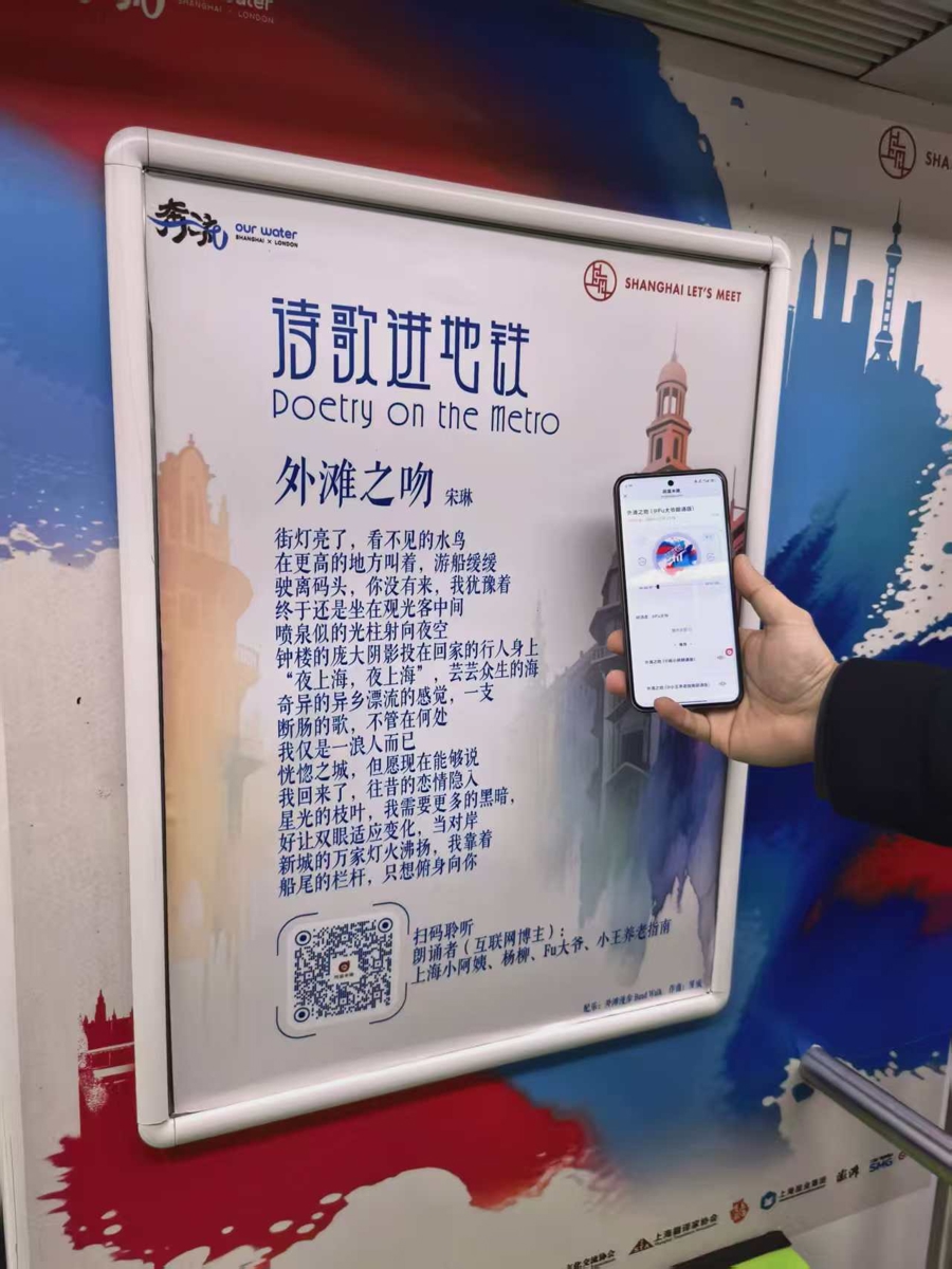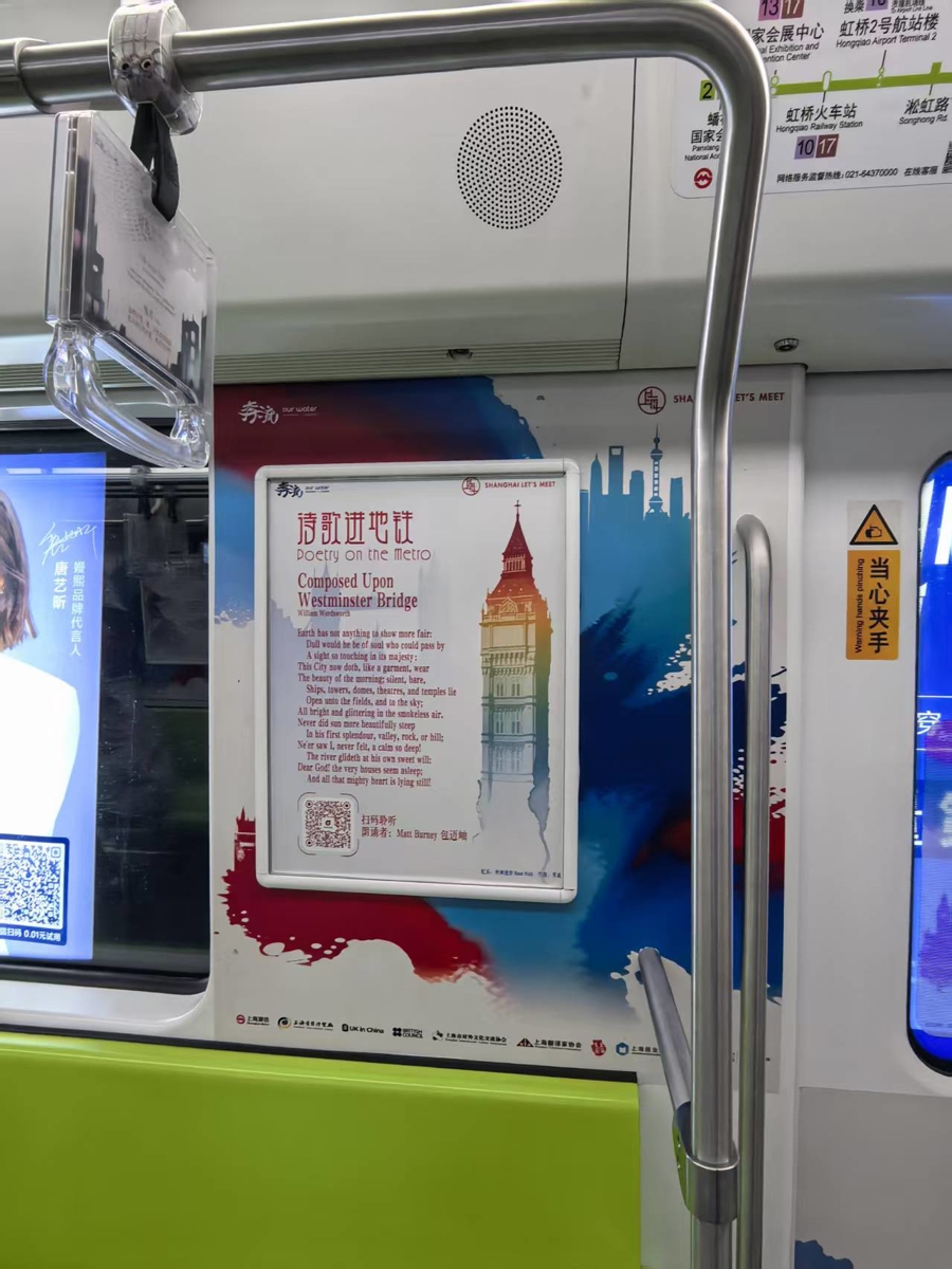 11月19日至12月19日期间,作为《奔流》第二季“上海-伦敦”双城对话系列活动之一,八首来自中国和英国的经典诗歌登陆上海地铁2号线。这是继2006年起步的“中外诗歌进地铁”活动以来第八次民间文化交流的跨国牵手。