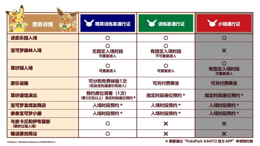 据悉,11月21日18时起,开始销售的门票分为“精英训练家通行证”和“训练家通行证”2种,2种门票均包含读卖乐园的入园资格。值得注意的是,为保障各位训练家的安全,未满5周岁的儿童及同行游客、无法攀登110级台阶的游客等符合官方网站“票务信息”所列的限制条件者,即使有人陪同协助股粮网,也不能入场。对于无法进入宝可梦森林,或仅希望进入草纱镇的游客,“小镇通行证”将于明年夏季前后开始销售。